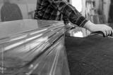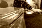 Work in a glass factory. A glazier places a sheet of glass on a specialized table. Close up