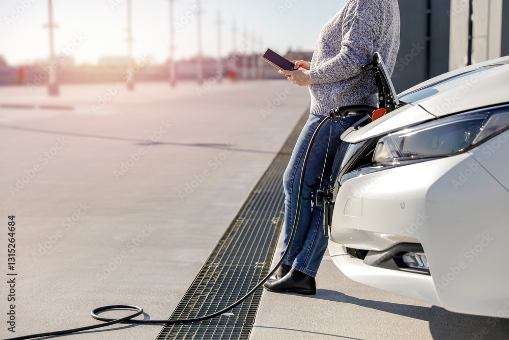 A woman holding a smartphone, standing next to electric car while charging. Parking area with clear sky background.