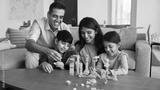 Indian couple playing construction blocks set together with little children. Siblings sit on floor at table, enjoy carefree playtime with parents. Loving family weekend leisure at home, creative games