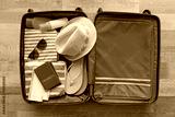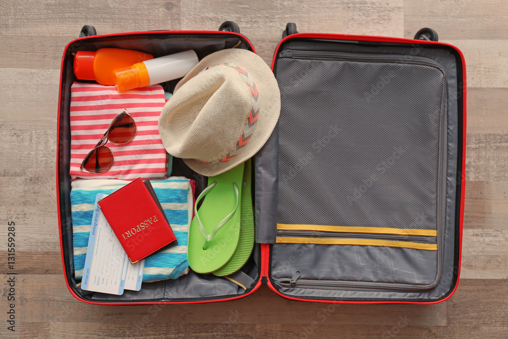 Open suitcase packed for travelling, close up