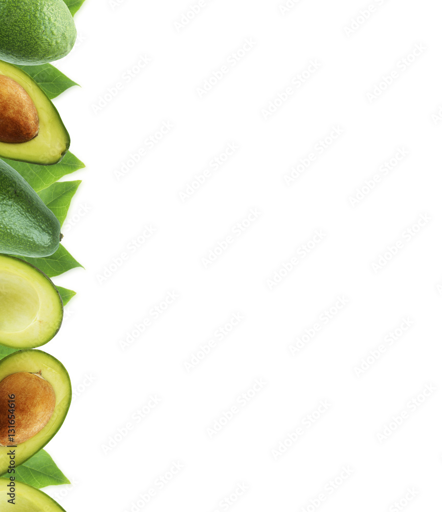 Fresh avocado with leaves on white background. Halves of fresh avocado at border of image with copy space for text. Top view. Vegetarian or healthy eating.
