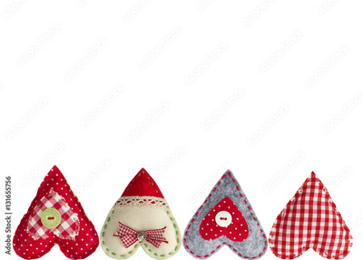 Hand made textile hearts. Textile handicraft isolated on white background. Valentines Day, Wedding composition with hearts. Top view.