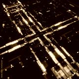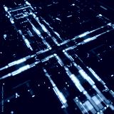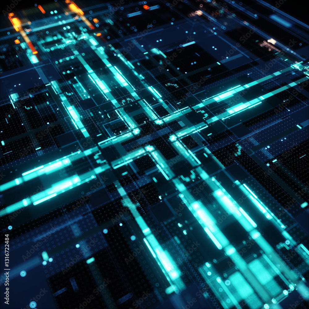 Futuristic digital grid with glowing cyan and orange elements. Complex circuitry pattern evokes advanced technology and AI systems. Ideal for high-tech, cyber, or data themes
