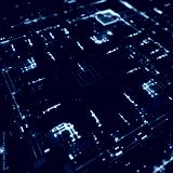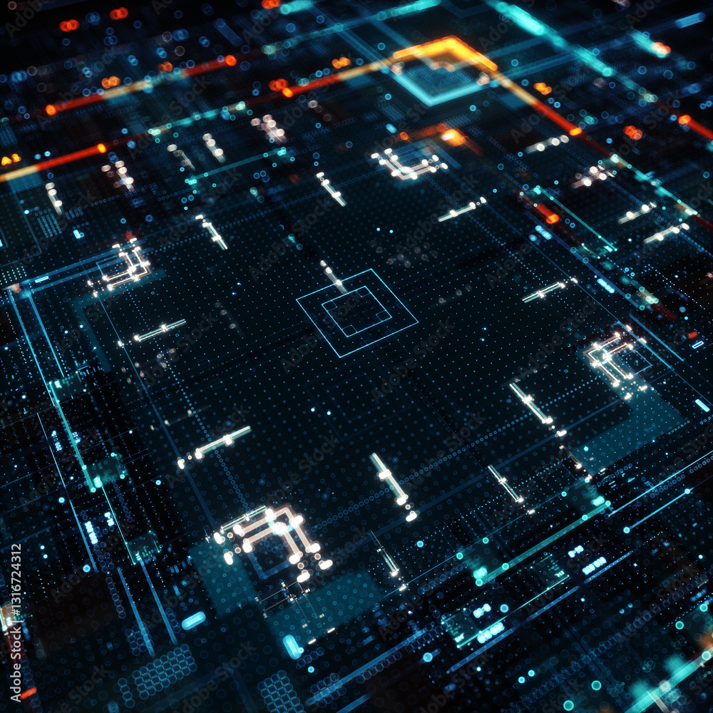 Futuristic digital grid with glowing cyan and orange elements. Complex circuitry pattern evokes advanced technology and AI systems. Ideal for high-tech, cyber, or data themes