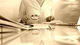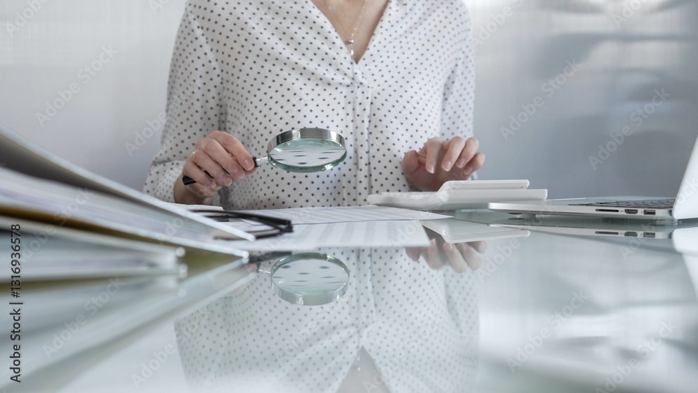 Businesswoman carefully reviewing financial reports with magnifying glass and calculator, conducting audit and analyzing data. Taxes, audit in business