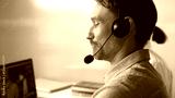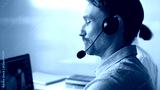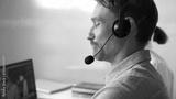 Happy smiling male call center operator in blue casual shirt is assisting clients online, providing customer support and answering inquiries. Business call center