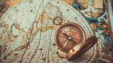 Old compass with cover lid on ancient world map background; a pirate rare item collection. (vintage style)