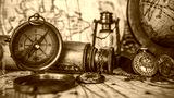 Old vintage retro compass, magnifying glass and glass oil lamp on ancient world map. (vintage style)