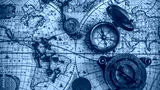 Antique pirate rare items collections including with a compass, retro vintage skeleton key bottle opener, brass pocket compass with cover lid, bronze coin on ancient world map. (vintage style)