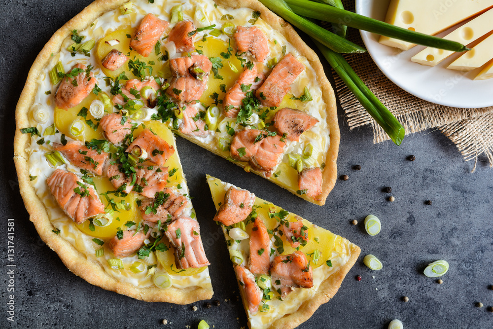 Quiche with salmon, cheese, sour cream, green onion and parsley