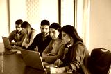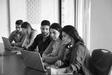 Group of focused workmates looking at laptop screen, watching content related to their workflow, review new software, considering details, working together on online presentation gathered in coworking