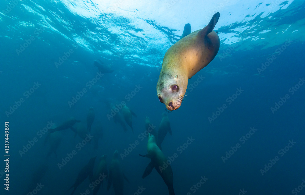 Seal swimming in the water. Underwater sea lion portrait. Sea lion in underwater world