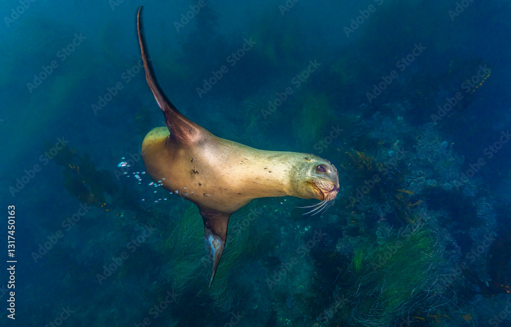 Seal swim underwater. Underwater sea lion view. Sea lion in underwater world