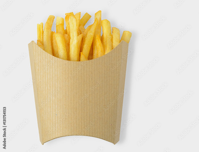 French fries in kraft blank paper box isolated on white background with clipping path.