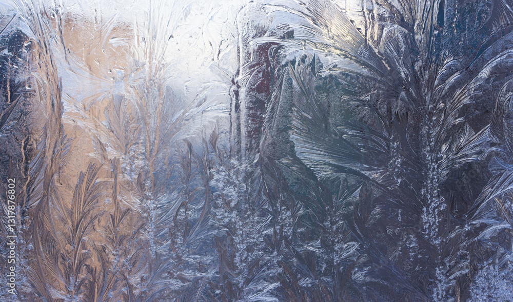 Blue Frost Background, Closeup Frozen Winter Window Pane Coated Shiny Icy Frost Patterns, Extreme North Low Temperature, Natural Ice Pattern on a Frosty Glass