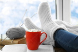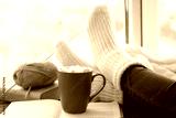 Human legs in knitted socks on windowsill beside cup of coffee and books