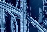 Aerial view of multiple highways intersect above a calm river, surrounded by vibrant greenery.
