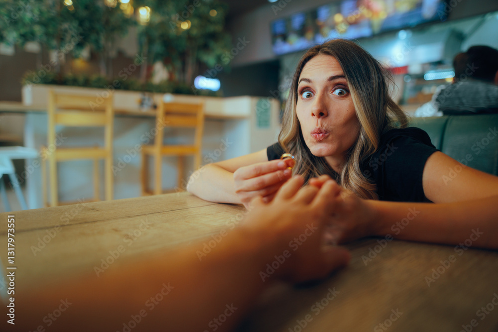 Funny Girlfriend Asking her Boyfriend in Marriage at the Fast Food. Woman proposing to her beloved partner with a wedding ring