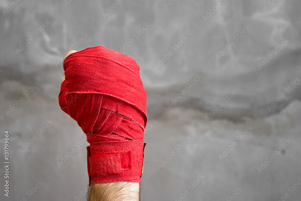 Cropped shot of a boxer's hand wrapped with red boxing tape