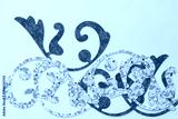 layered, machine-cut decorative curved paper flourishes in mostly blue and gray on blank paper