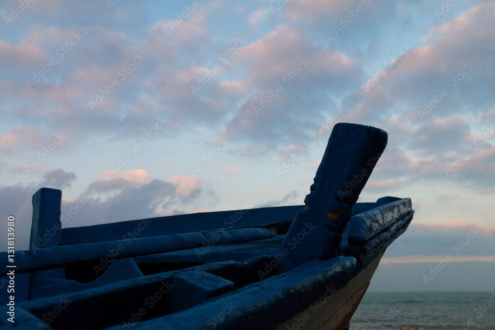 Detail of the prow of a wooden boat at sunset