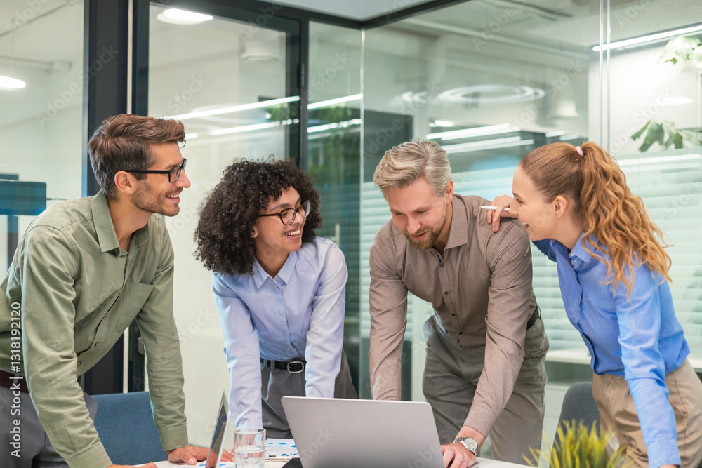 Business people discussing work together using a tablet and laptop taking notes in a modern office