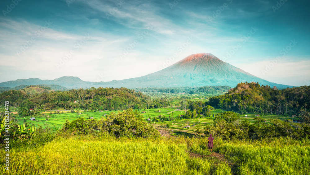 Nature landscape tropical island with scenery rice field and volcano on nature background