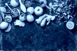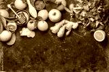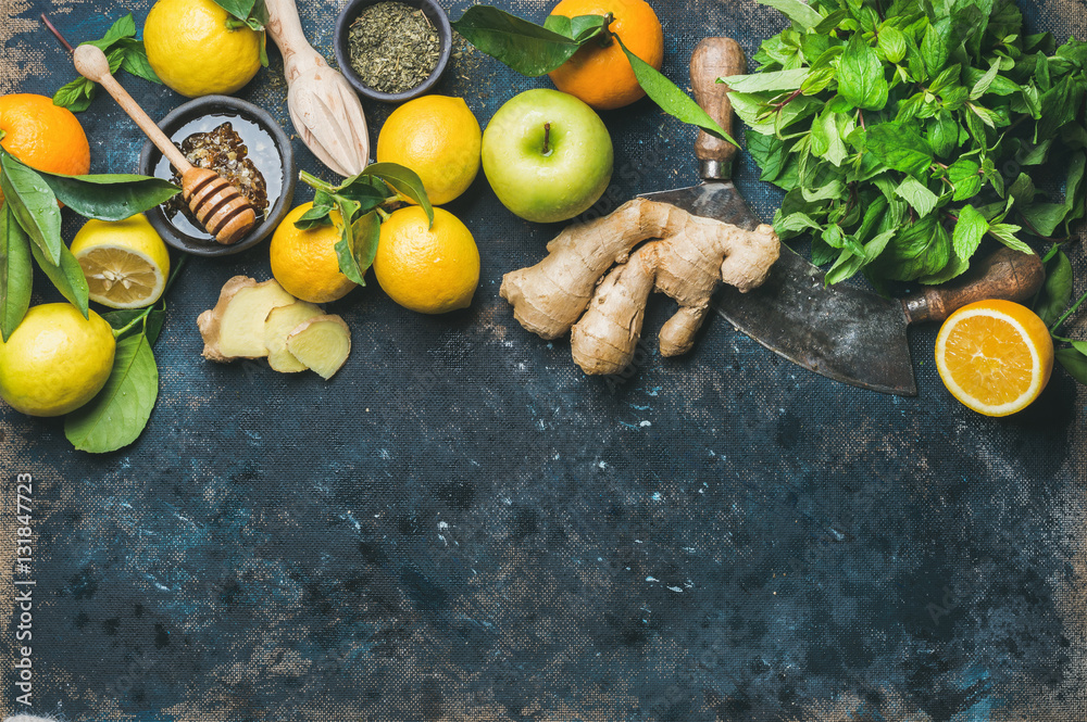 Ingredients for making flu fighting natural hot drink. Oranges, mint, lemons, ginger, honey, apple and spices over plywood background, top view, copy space. Clean eating, detox, dieting concept