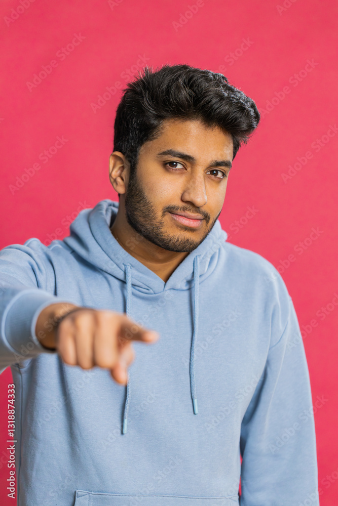 I choose you. Indian smiling man pointing finger to camera and looking with playful happy expression, making winner choice, showing direction. Arabian young guy isolated on red studio background