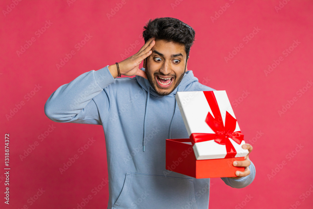 Excited Indian man receiving a festive gift with a red bow opening the box with joy celebrating a surprise. Happy Arabian guy enjoying dream present smiling with excitement isolated on red background