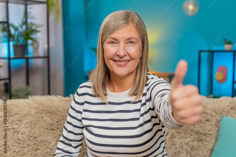 Like sign. Caucasian mature woman gives thumbs up sitting on home sofa, smiling and showing approval support. Grandmother expresses positivity and encouragement, positive feedback, good great news