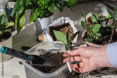 Close-up of a cutting of a laurel bush. Propagation and transplantation into containers at home.