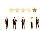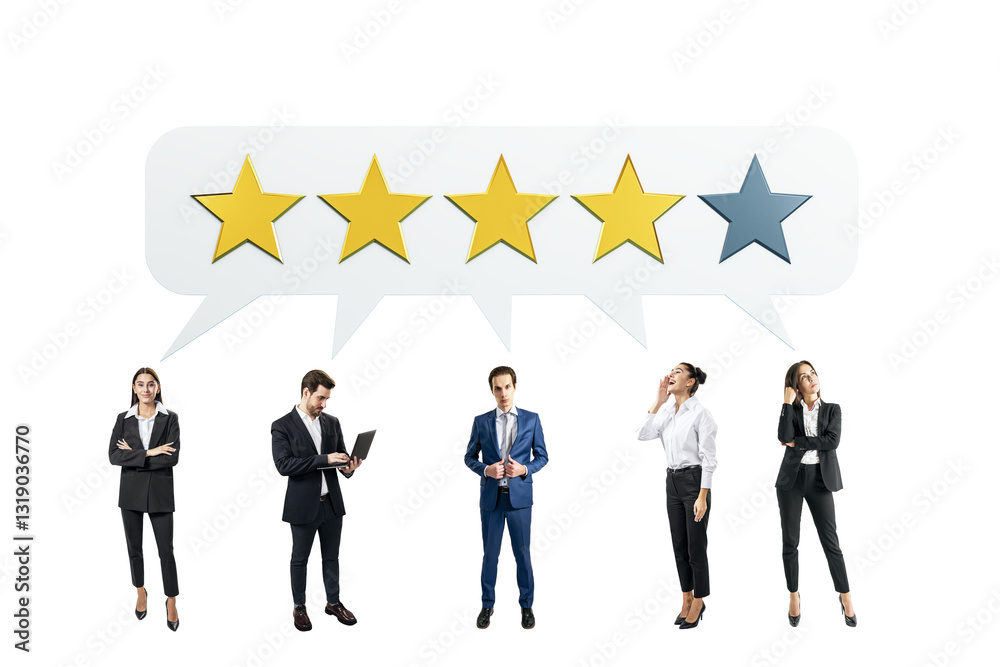 Group of businesspeople with rating stars in speech bubbles above them, standing on white background. Concept of feedback, ranking, evaluation
