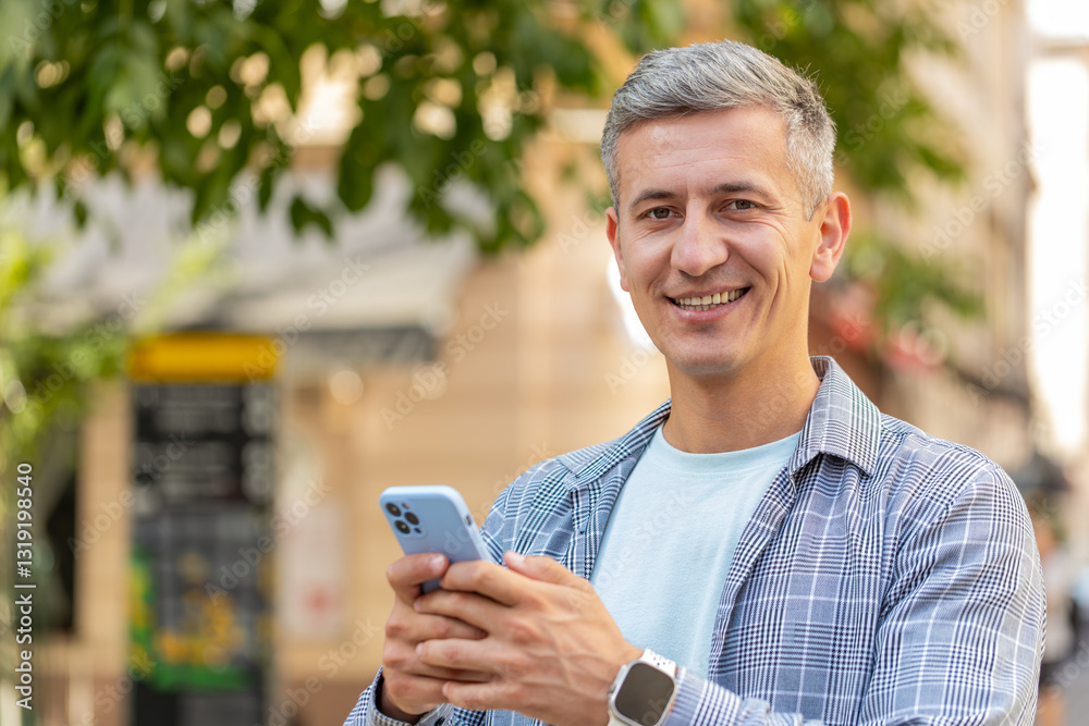 Smiling mature man using smartphone typing text messages browsing internet, finishing work, looking at camera outdoors. Middle-aged guy tourist standing in urban city street outside. Town lifestyles.