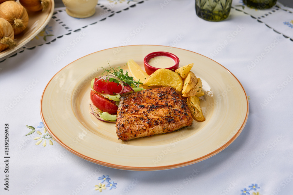 Gourmet Grilled Trout with Baked Potatoes and Fresh Vegetable Salad on Elegant Table Setting