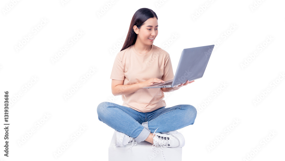 Cheerful young asian woman sitting cross-legged on a white cube while using a laptop. She wears T-shirt and blue jeans, smiling as she interacts with the mobile phone isolated on white background