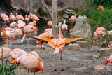 Pink exotic flamingo farm. Incredible, beautiful exotic birds near the pond.