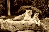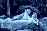 Close-up. A family of incredibly beautiful lions lies on a stone in their area and inspects the territory.