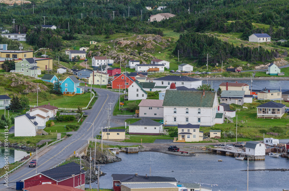 Small village community, Twillingate, Newfoundland. Homes along shoreline in this coastal village, local roads connect the community along the Island's edges.