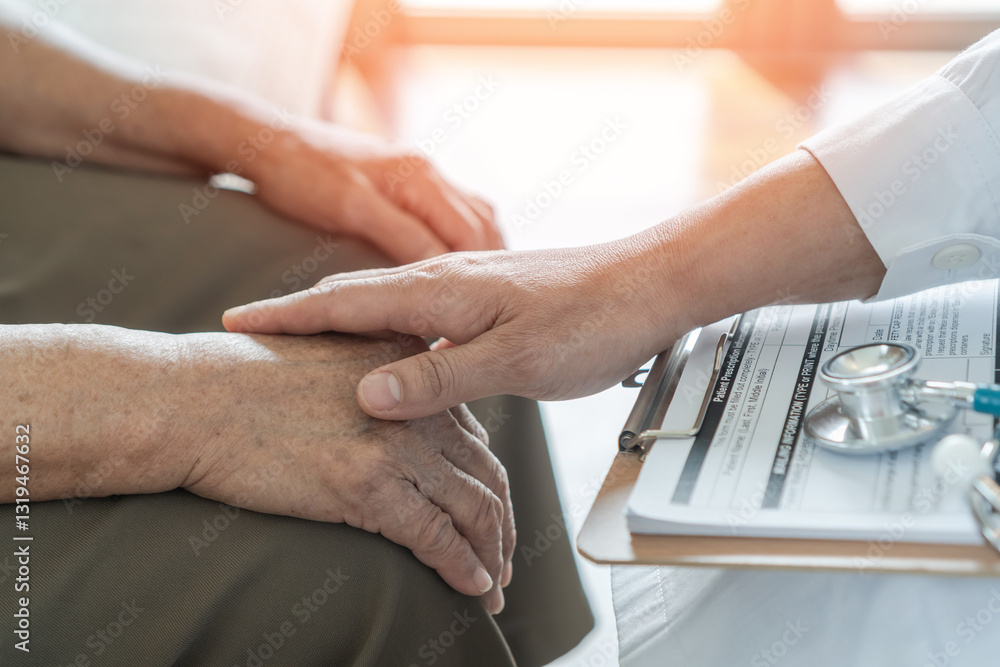 Parkinson disease patient, Alzheimer elderly senior, Arthritis person's hand in support of geriatric doctor or nursing caregiver, for disability awareness day, ageing society care service