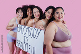latin group of women with different age, skin and body holding a Body Positive board in Mexico Latin America, hispanic female in underwear or lingerie for self love on pink background
