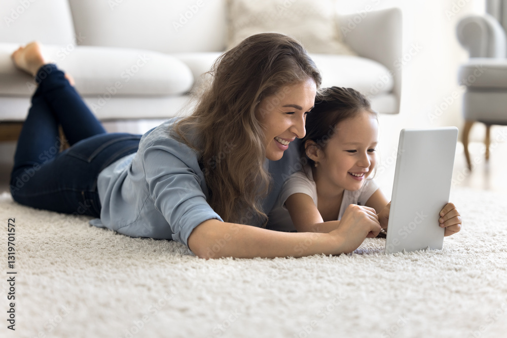 Digital family time. Happy bonding young mom little child daughter relax on floor lie on cozy carpet hug look on tablet screen engaged in interactive online learning use web app to play education game