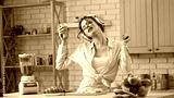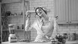 Young woman at the table in the kitchen preparing healthy breakfast, listens music in headphones on smartphone, dancing and drinking smoothie.