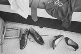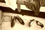 Female and man footwear and clothing in a hotel room, vintage toned conceptual picture.