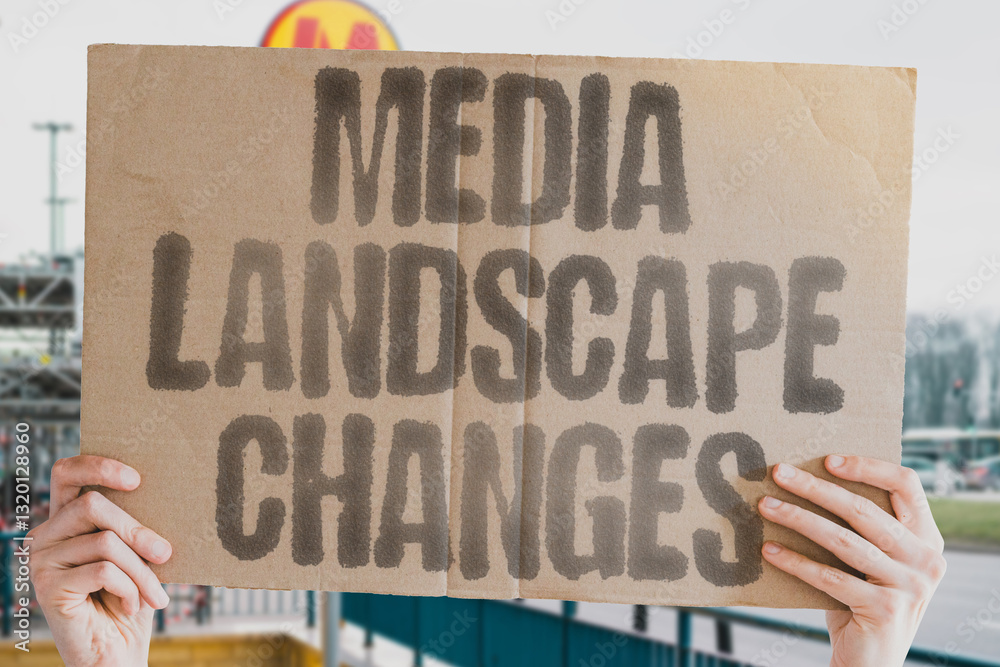 "Media landscape changes" on worn cardboard. Highlights how news and info spread is evolving. DIGITAL. PLATFORMS. CONSUMPTION. SOURCES. CREDIBILITY. ALGORITHMS. INFLUENCE