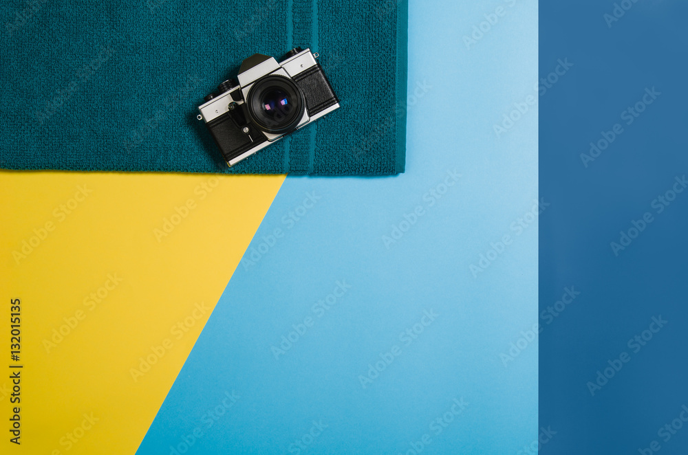 Top view of colorful, graphical sandy beach with summer accessories and copy space around products. Blank mock up for advertising or packaging. Colourful frame with graphical backdrop