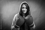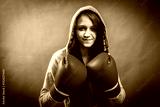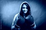 Boxer woman during boxing exercise making direct hit