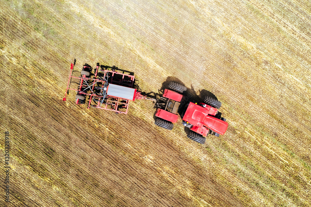 tractor working in field on bright sunny day. The concept of work in fields and agriculture industry. Plowing the land with a plow using a tractor. harvesting, tillage of soil and plants. aerial view,