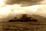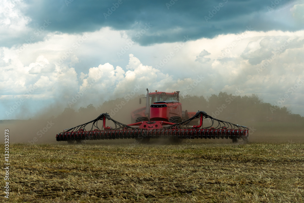Red tractor working in field on a bright sunny day. The concept of work in a fields and agriculture industry. Plowing the land with a plow using a tractor. harvesting, tillage of soil and plants.