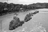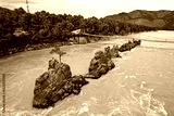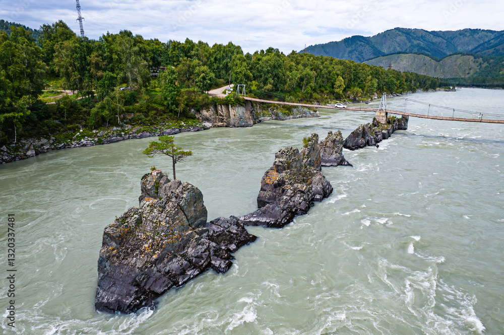 Dragon Teeth Rocks on Katun. Sharp triangular rocks in bed of a mountain river with emerald turquoise water. Altai Republic, Siberia, Russia. view from above